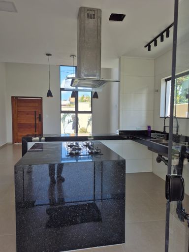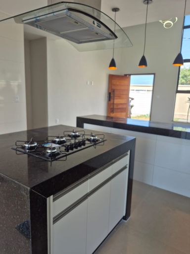 🍽️ Cozinha em conceito aberto com ilha, cooktop, coifa e armário planejado.
